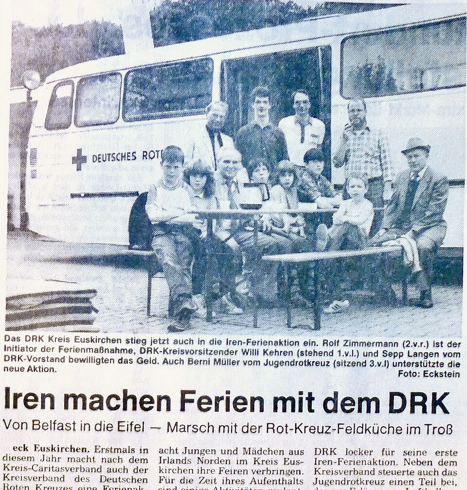 Von 1974 an haben Caritas und Rotes Kreuz und viele Familien im Raum Euskirchen, Mechernich, Zülpich, Weilerswist und Bad Münstereifel mindestens 15 Jahre lang die Aktion „Euro-Children“ unterstützt. Bei dieser Aktion wurden Kinder aus Nordirland für einige Wochen nach Euskirchen in Gastfamilien eingeladen. „Das war eine klasse Zeit, die mich sehr geprägt hat“, konstatierte Rolf Zimmermann in einer Interviewrunde mit einer Mitarbeiterin der irischen Botschaft