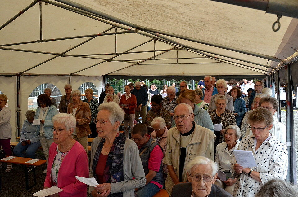 Mechernich – Das Zelt war aufgebaut, die Instrumente gestimmt… und das traditionsreiche Mechernicher Bergfest konnte wieder losgehen. Zelebriert wurde es im Rahmen eines Open-Air-Gottesdienstes am Bergbaumuseum mit GdG-Pfarrer Erik Pühringer, samt kirchlicher Live-Musik der Mechernicher Bergkapelle und gemeinsamem speisen, trinken und plaudern im Nachgang.
