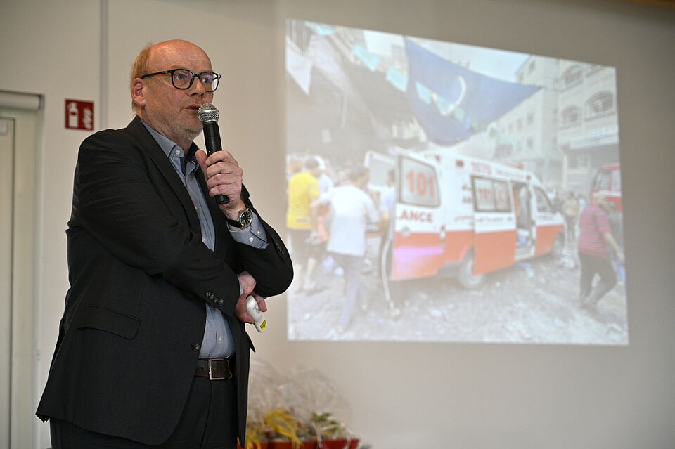 Ein weiteres Beispiel für internationale Zusammenarbeit ist ein provisorisches Krankenhaus in Gaza, wo in fast einem Jahr schon 65.000 Menschen, meist Kriegsverletzte, behandelt wurden. „Das Leid haben wir noch nie erlebt“, schilderte er die Erfahrungen der Wiederkehrer: „sie kommen aus einer anderen Welt zurück…“
