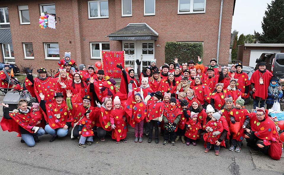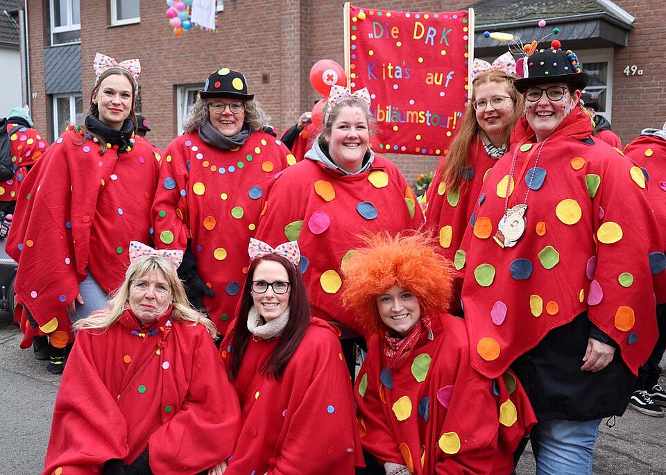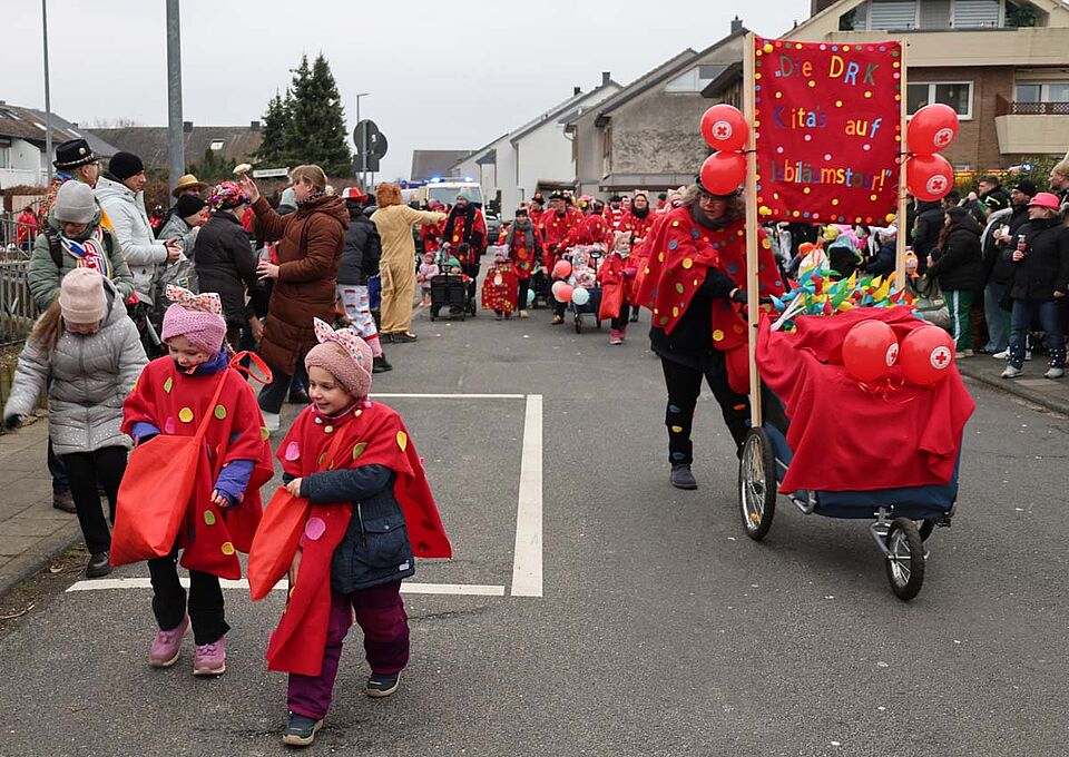 Weilerswist – Bunte Konfetti-Punkte auf rotkreuzroten Umhängen machen die Karnevalsgruppe der Weilerswister Rotkreuz-Kitas zu einem Hingucker. Sie gehören zu den größten Gruppen im Weilerswister Nelkensamstagszug und sind seit zehn Jahren fester Bestandteil des närrischen Lindwurms. In diesem Jahr sind die beiden Kindertagesstätten mit zwei weiteren Festen auf Jubiläumstour: Die DRK-Kita Spatzennest wird 30 Jahre, die DRK-Kita Sonnenblume sogar schon 50 Jahre alt.