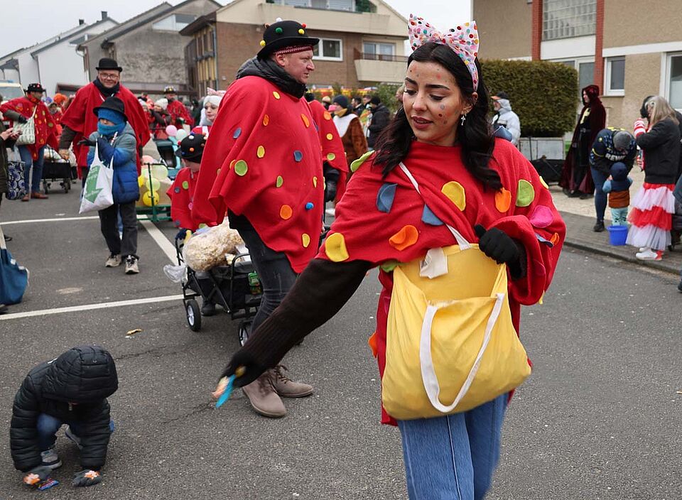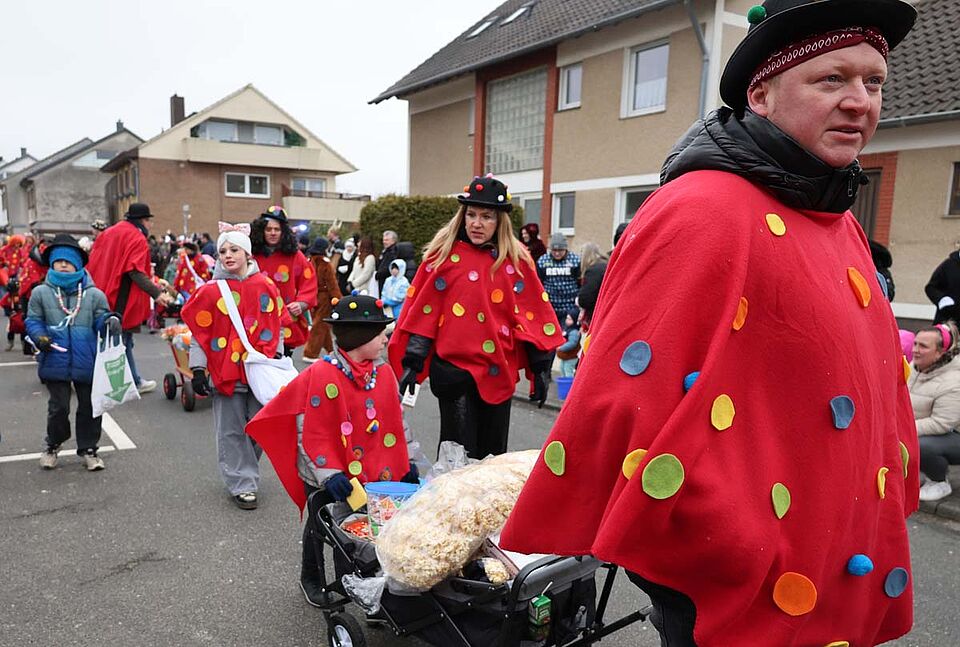 Individuell ergänzt wurden die Outfits dann beispielsweise durch gepunktete Schleifen oder Hüte, bunte Karnevalsschminke und Luftballons an Boller- und Kinderwagen. Darin hatten die Kinder der Fußgruppe dann auch eine Rückzugsmöglichkeit, schließlich zieht der Karnevalszug bis zu drei Stunden durch die Straßen von Weilerswist. „Danach sind unsere Kinder meist glücklich platt“, erzählt Jasmin Normann lachend.