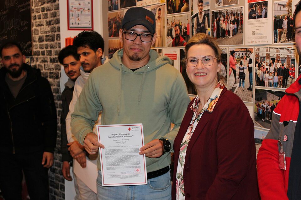 Demokratie lernt man nicht allein aus Büchern. Man muss sie sehen, hören, hinterfragen und erleben. Damit das gelingt, gibt es das Projekt „Komm mit – Demokratie zum Anfassen“, das die Integrationsagentur und die Servicestelle Antidiskriminierungsarbeit des DRK Euskirchen in diesem Jahr zum zweiten Mal im Auftrag der Stadt Euskirchen durchgeführt hat. Die Ergebnisse (und Erlebnisse) wurden jetzt bei einer Feier im Café Henry der Öffentlichkeit präsentiert. Wie schon im letzten Jahr waren die Wände auch diesmal wieder gespickt mit bunten Fotos, die die Geschichten eines spannenden Halbjahrs erzählten. Mit sehenswertem Ergebnis: Aus den Händen der stellvertretenden Bürgermeisterin Sandra Eisermann erhielten die dreißig Teilnehmenden ihre Zertifikate. Stolz und strahlend hielten die neu zugewanderten Kinder, Jugendlichen und jungen Erwachsenen die Teilnehmer-Urkunden in die Höhe. Das meist gehörte Wort an diesem Nachmittag – eindeutig: „Danke!“