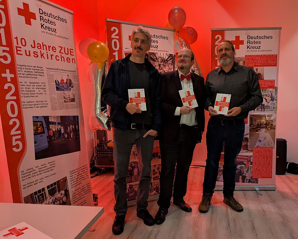 Der Reihe nach rief er die Festredner nach vorne. Unter anderem gratulierten der Vorsitzende Karl Werner Zimmermann sowie der Geschäftsführer Rolf Klöcker herzlich und erinnerten an die „turbulente Anfangszeit“, die ohne die Unterstützung der damaligen Ehrenamtlerinnen und Ehrenamtler „nicht zu stemmen gewesen sei“. Darüber hinaus würdigten sie die Flüchtlingshilfe im Ganzen - einschließlich der ehemaligen Einrichtungen in Kronenburg, Gemünd, Vogelsang, Hellenthal und Marmagen. Auch eine Festschrift, die einen Überblick über die Geschichte der DRK-Flüchtlingshilfe im Kreis gibt, lag zur Mitnahme bereit – gestaltet von Markus Heinen, Thomas Schaps und Andreas Züll.
