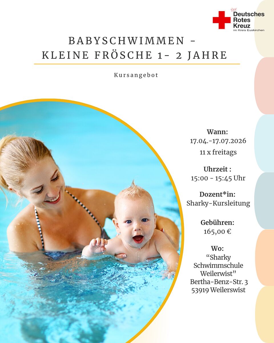 Weilerswist – Wer einen „kleinen Frosch“ zu Hause hat, ist beim Babyschwimmen des Roten Kreuzes im Kreis Euskirchen (DRK) genau richtig. Jeden Freitag findet das Schwimmen für Babys von ein bis zwei Jahren zusammen mit ihren Eltern von 15 bis 15.45 Uhr in der „Sharky Schwimmschule Weilerswist“ (Bertha-Benz-Straße 3) statt.