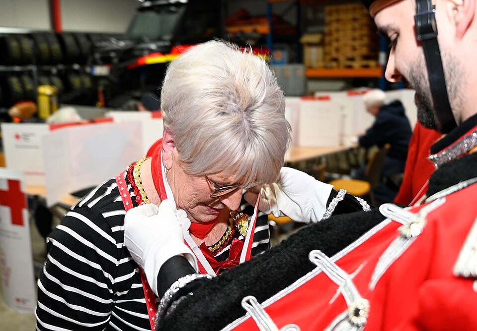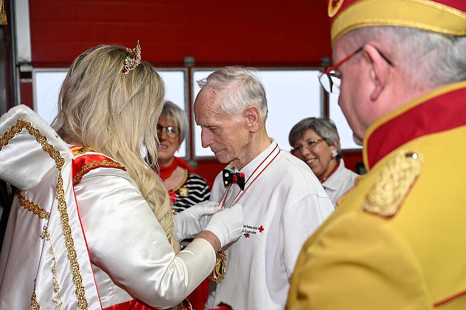 Besonders bewegend sprach die Prinzessin über ihre persönliche Beziehung zu Dieter Pape, langjähriger Helfer bei der DRK-Blutspende und Gründungsmitglied der KG EG Südstaat von 1999 e.V., in der Colette Vizepräsidentin ist. Sie überreichte ihm einen Orden und würdigte ihn als „einen der liebsten Menschen der Stadt“ – ebenso wie seine Frau Margretchen Pape, legendäre Büttenrednerin, der sie beim Südstadtzug auch noch einen Orden überreichen will.