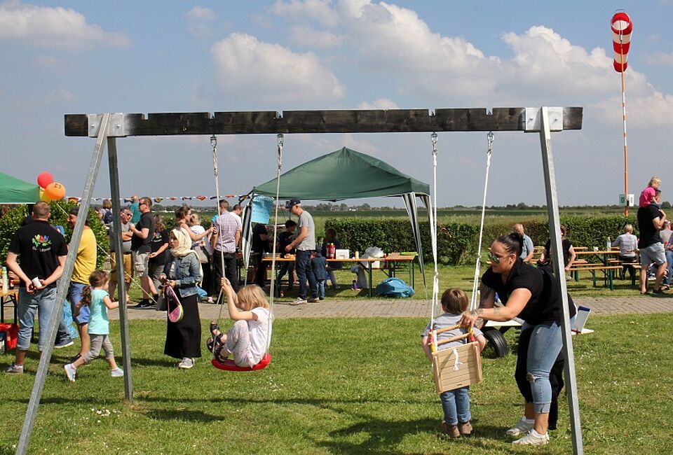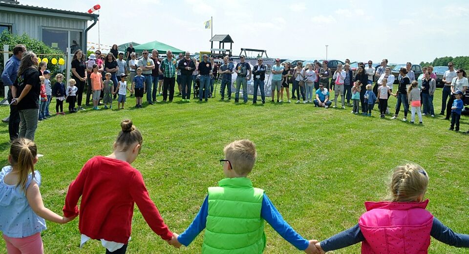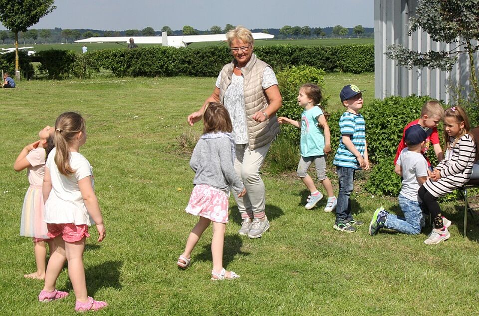Seit dem Projekt sind der Kindergarten und die Flug-Verein befreundet, wie Kita-Leiterin Conny Valerius mitteilte. Alle zwei Jahre stellen die Ultraleichtflieger der Kita ihren Flugplatz zum ganz besonderen Sommerfest, dem Flugfest, zur Verfügung. Zum neunten Mal fand es nun statt – und es ist eben sowohl alltägliche Kindergartenfeier mit von den Eltern mitgebrachten Kaffee und Kuchen, mit Kinderwettbewerben und ganz normalem Spielen. Aber es ist eben auch wieder etwas Spezielles.